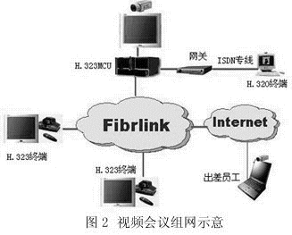 目前視頻會議系統(tǒng)主要有兩大類:一種基于H.320協(xié)議標準,另一種基于H.323協(xié)議標準。H.320會議系統(tǒng)技術(shù)成熟,運行穩(wěn)定,圖像質(zhì)量高,但業(yè)務功能單一,組網(wǎng)不夠靈活;H.323會議系統(tǒng)是最近兩年興起的視頻會議系統(tǒng),運行在廣泛存在的IP網(wǎng)絡之上,以功能豐富、組網(wǎng)方便靈活等為主要特征,成為視頻會議系統(tǒng)的發(fā)展方向,但其視頻質(zhì)量很大程度上依賴于所承載的IP網(wǎng)絡的質(zhì)量。中電飛華公司基于FibrLINK平臺,為用戶提供H.320、H.323以及H.320和H.323混合組網(wǎng)的視頻會議系統(tǒng)建設,如圖2所示。