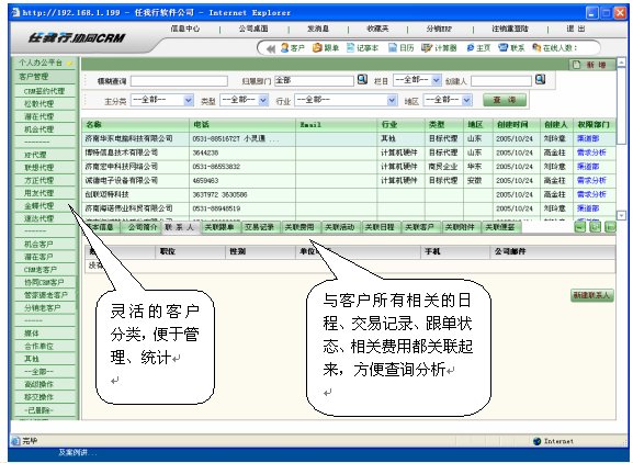 任我行-協(xié)同CRM把企業(yè)各部門與客戶交往過程中的所有記錄,比如業(yè)務(wù)記錄、業(yè)務(wù)員日程按排、客服記錄、銷售過程、工作報(bào)告、業(yè)務(wù)合同、銷售記錄、銷售費(fèi)用等,進(jìn)行這樣分類管理,這樣,就把企業(yè)離散的客戶資料統(tǒng)一管理起來,把企業(yè)個(gè)部門與客戶的銷售過程及服務(wù)等信息象珠子一樣串起來,而不是以前那種散亂、信息殘缺,讓查閱者對所需要關(guān)注的客戶"一目了然"。