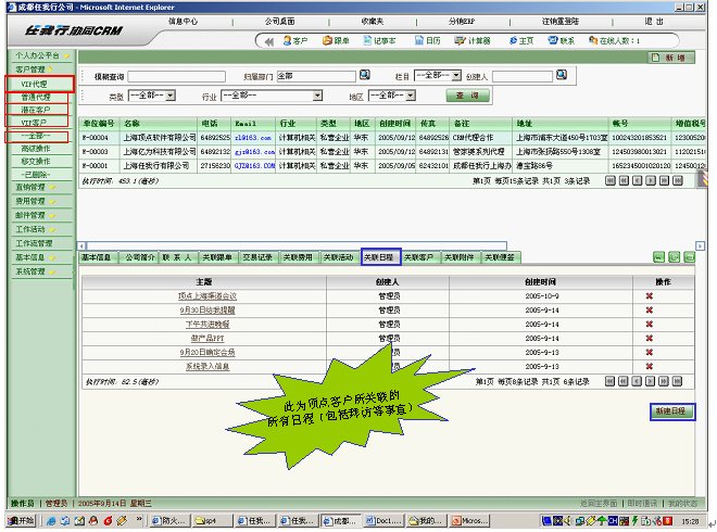 和傳統(tǒng)日程相比,傳統(tǒng)日程是不和客戶掛鉤的,事后查閱很不方便,就好比在一個(gè)筆記本上去查詢以前的筆記,要找出與某個(gè)客戶的日程安排,根本不可能,而且,很多人的備忘錄寫了之后,也不會再去翻閱了。有了客戶相關(guān)聯(lián)的日程后,以后通過客戶為入口,可以很清楚的查閱XX時(shí)候,XX人和該客戶交往的日程安排及記錄。