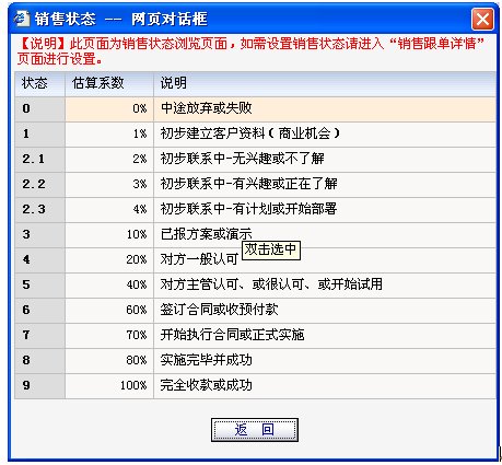 銷售過程量化管理,即對銷售活動(dòng)進(jìn)展的數(shù)字化。從目標(biāo)客戶建立到簽約成交的過程中,按客戶需求變化以及我們提供咨詢的不同來分成若干個(gè)階段,我們把這些不同的階段描述出來,并用一個(gè)數(shù)字或百分比來替代。如:10%指的是客戶有這方面的需求意向,但對我們并沒有特別的關(guān)注;50%即可以表示需求強(qiáng)烈并偏愛于我們;而70%則可能到了談合作的相關(guān)條款等。這樣就讓本來靜止在紙上的業(yè)務(wù)報(bào)告變成了動(dòng)態(tài)的分析數(shù)據(jù)。