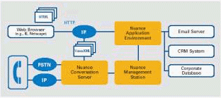 Nuance Conversation Server對話服務(wù)器包括了與Nuance 語音識別模塊集成在一起的VoiceXML解釋器,文語轉(zhuǎn)換器(TTS)以及聲紋鑒別軟件。通過標(biāo)準(zhǔn)的互聯(lián)網(wǎng)絡(luò)協(xié)議,Nuance 對話服務(wù)器能得到Nuance 應(yīng)用環(huán)境中產(chǎn)生的VoiceXML應(yīng)用程序。Nuance對話服務(wù)器通過廉價(jià)的、非定制 的語音卡或者VoIP (Voice over IP)的支持,還能提供對電話網(wǎng)的接口。
