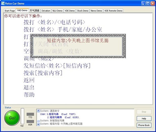 Nuance:可以修改。到你需要修改的那個(gè)“見”上,你再說“見”或者見面,它就給你弄過來了。但是我們覺得在中國(guó)區(qū),在中文的修改上,這未必可能是個(gè)好辦法,我們也在試探另外一種辦法,這個(gè)辦法我現(xiàn)在可以給大家介紹一下。就是這樣,我要說修改,那么那個(gè)語(yǔ)音合成TS就開始給你再讀,剛才不是讀了一遍嗎,它再給你讀,但是這一次讀,它是一個(gè)詞一個(gè)詞地讀。他說,今天我不吭聲,晚上,我不吭聲,他說七點(diǎn),我也不吭聲,等他說“見”的時(shí)候,我說“見面”,他知道我說的這個(gè)詞要把那個(gè)覆蓋掉,再改,再把它改了。這樣可能更合理一些,就是你手不用去摸什么東西,眼睛看什么東西,完全能保持你在駕駛的時(shí)候,這是我們目前還在進(jìn)行開發(fā)的一個(gè)東西,或許下一次如果我們?cè)儆袡C(jī)會(huì)我們就可以把這個(gè)演示一下。
