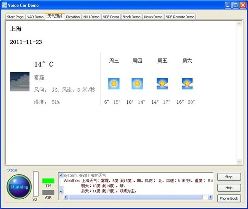 比方說這個(gè)關(guān)于空調(diào)問題,我們過去,空調(diào)的命令詞是“把空調(diào)打開,空調(diào)溫度提高3度。”現(xiàn)在我也可以這樣說,空調(diào)調(diào)高一點(diǎn),我有點(diǎn)冷,也可以。就是你在車?yán)镞呁耆梢杂媚阕约旱恼Z(yǔ)言來說你想干的事。比如說,前邊你不知道明天天氣會(huì)怎么樣,人一般都會(huì)想想,明天天氣如何,或者是告訴我天氣預(yù)報(bào)。但是你也可以這樣說。明天會(huì)下雨嗎?也可以這樣說;蛘吣氵@樣說,你說,今天大盤怎么樣。完全是用自然語(yǔ)言來說。堵不堵車,“查詢交通情況!边@就是,實(shí)際上可以有各種不同的說法來完成這個(gè)任務(wù),這是我們自然語(yǔ)言的一個(gè)演示。