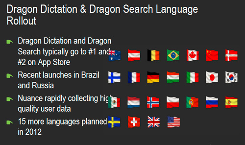 當(dāng)然,Nuance自己也開發(fā)面向大眾消費(fèi)者的語音控制軟件,包括Dragon Dictation、Dragon TV、Dragon Search、及Dragon Go!等。目前已有上億部智能手機(jī)、車載導(dǎo)航系統(tǒng)等裝置采用了Nuance的語音軟件,三星、諾基亞、摩托羅拉、HTC、福特、寶馬、大眾、奧迪等公司都是Nuance的合作伙伴,每一部采用其聲控軟件的智能手機(jī)和裝載了其聲控導(dǎo)航的汽車,都將向Nuance繳納一定的授權(quán)使用費(fèi)。