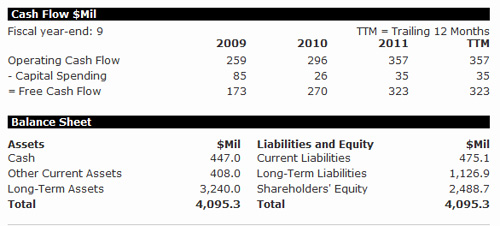 截至2011年9月30日,Nuance現(xiàn)金及現(xiàn)金等價(jià)物為4.47億美元。2011財(cái)年經(jīng)營性現(xiàn)金流為3.57億美元。