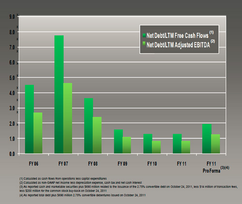 截至2011年9月30日,公司總計(jì)持有債務(wù)8.874億美元。其中1.45億美元短期貸款(term loans)2013年3月到期,4.92億美元2016年3月到期,此外還有2.5億美元的可轉(zhuǎn)債。2011年10月24日,公司繼續(xù)發(fā)行價(jià)值6.9億美元的可轉(zhuǎn)債,利率為2.75%,2031年11月1日到期。
