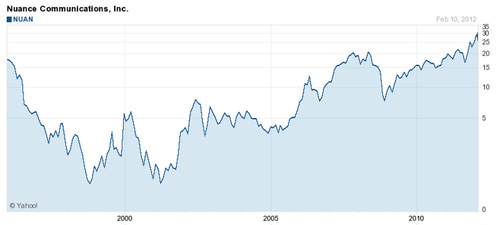 截至美東時(shí)間2012年2月10日收盤,Nuance收報(bào)26.49美元,當(dāng)前市值80億美元,TTM市盈率高達(dá)218倍。最近半年股價(jià)累計(jì)漲幅達(dá)47%,并于今年年初創(chuàng)下了31美元的新高。
