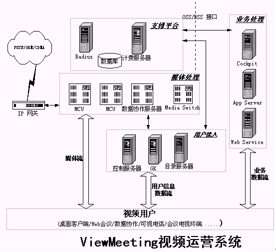 發(fā)展寬帶視頻業(yè)務(wù),提供寬帶視頻通信解決方案是優(yōu)視風(fēng)的宗旨,利用ViewMeeting平臺(tái)(如圖1所示),運(yùn)營(yíng)企業(yè)可以制定針對(duì)不同用戶需求的不同視頻業(yè)務(wù),使視頻業(yè)務(wù)能夠普及到更廣的用戶范圍中。