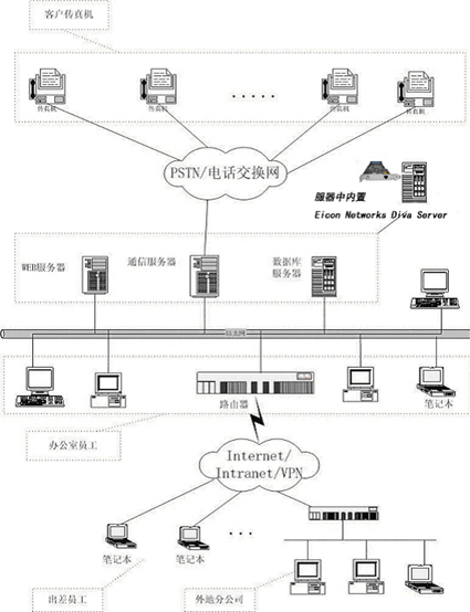 本系統(tǒng)采用最新的J2EE WEB技術(shù),在組成結(jié)構(gòu)上主要由以下三大模塊組成:1)WEB服務(wù)器: 完成用戶(hù)通過(guò)IE瀏覽器接入訪(fǎng)問(wèn), 傳真發(fā)送及接收的操作界面,傳真結(jié)果的查詢(xún),客戶(hù)地址本的維護(hù)等工作;2)傳真發(fā)送/接收通信服務(wù)器:主要完成驅(qū)動(dòng)傳真板卡,通過(guò)通信線(xiàn)路收發(fā)傳真,檢測(cè)通信線(xiàn)路、對(duì)方狀態(tài),發(fā)送接收隊(duì)列管理等工作;3)數(shù)據(jù)庫(kù)服務(wù)器:主要負(fù)責(zé)用戶(hù)信息,用戶(hù)地址本信息,傳真記錄等信息存儲(chǔ)工作。