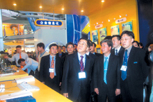 金弘基先生(前排左一)帶領參觀者參觀三星SDS公司在COMDEX/China 2002上的展臺。
