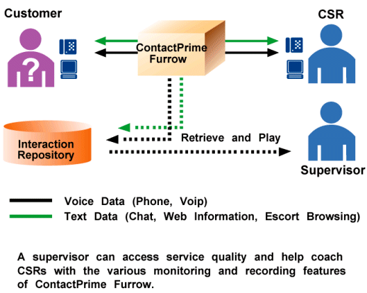 ContactPrime Furrow提供的完全記錄解決方案可以協(xié)助進(jìn)行訓(xùn)練、性能評估、交易驗(yàn)證與爭議解決等工作。不僅記錄語音呼叫,而且對于聊天、陪同瀏覽和Web互操作等文本行為也可記錄。