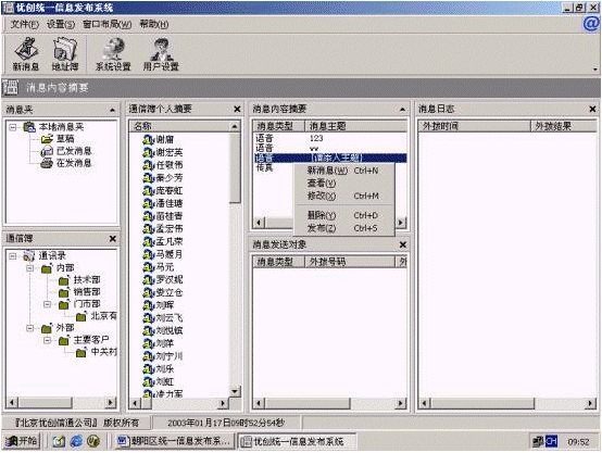 北京優(yōu)創(chuàng)信通科技公司基于完全自主版權的 SmartMessage Pro架構,將 Windows OutLook有機擴展,是集CTI、TTS、CMPP、SMTP/POP3技術的統(tǒng)一消息轉換和發(fā)布一體化解決的產(chǎn)品,可以支持Intranet內(nèi)部網(wǎng)的電話語音/傳真、手機短信和Email消息的大量分發(fā)。