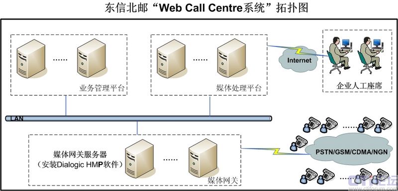 由于呼叫中心建設涉及技術十分專業(yè)、涉及領域也比較廣泛,必須投入巨大的資金購買軟硬件設備,因此對于中小企業(yè)而言建設自有的呼叫中心顯得不切實際。正是基于這種情況,東信北郵開始采用Dialogic HMP系統軟件建設呼叫中心系統,以托管方式為中小企業(yè)提供呼叫中心服務,即Web Call Centre服務。在項目建設過程中,東信北郵需要慎重選擇媒體處理軟件方案,努力做到突破傳統硬件方案的約束,力爭在系統靈活性、系統成本、系統可管理性、開發(fā)周期等方面獲得突破。