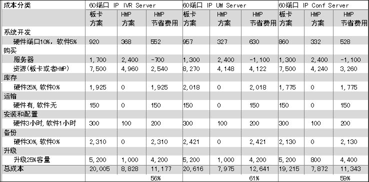 在眾多好處當(dāng)中,對(duì)用戶(hù)最有吸引力的無(wú)疑是節(jié)省成本。張怡國(guó)特別強(qiáng)調(diào),對(duì)一個(gè)應(yīng)用系統(tǒng)而言,成本的計(jì)算不應(yīng)該單以產(chǎn)品端口購(gòu)買(mǎi)價(jià)格考核,而應(yīng)該是系統(tǒng)總的建設(shè)成本,包括產(chǎn)品購(gòu)買(mǎi)成本、服務(wù)器成本、運(yùn)輸、安裝、庫(kù)存、升級(jí)等多項(xiàng)費(fèi)用;贖MP1.1版本,張怡國(guó)作了一個(gè)比較,以60端口IP IVR 60、端口IP UM或者60路會(huì)議為例,和語(yǔ)音板卡處理方式相比,基于HMP軟件實(shí)現(xiàn)能有近60%的成本節(jié)省,其中采購(gòu)能節(jié)省20%,庫(kù)存節(jié)省20%,備份節(jié)省20%,升級(jí)節(jié)省近40%。