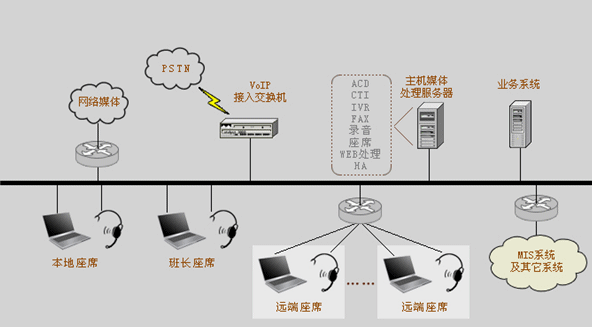 對(duì)于那些地區(qū)分布廣泛,而又要集中管理的單位,可在各個(gè)局部地區(qū)設(shè)置遠(yuǎn)端座席,并通過網(wǎng)絡(luò)方便的接入中心系統(tǒng)。系統(tǒng)為遠(yuǎn)端座席提供與中心座席完全相同的操作,遠(yuǎn)端座席可以根據(jù)各個(gè)地區(qū)的特定情況有針對(duì)性的處理各個(gè)局部地區(qū)的業(yè)務(wù),為中心分流壓力,同時(shí)中心系統(tǒng)也可以完全掌握遠(yuǎn)端座席的情況。