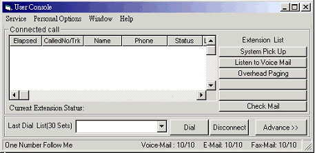 TelePCX 提供屏幕電話使用界面(User Console),提供每一個分機(jī)使用者一個GUI的計算機(jī)操控畫面,無論電話進(jìn)線時的聲響提示,Caller ID實時顯示以及完整的電話控制,從應(yīng)答,撥號,轉(zhuǎn)接乃至各種復(fù)雜的功能設(shè)置如:電話會議(多方通話)、多線電話跳接、通話中聯(lián)機(jī)實時錄音……等,均可經(jīng)由點按鼠標(biāo),由計算機(jī)上的畫面做實時的控制,不必記憶復(fù)雜的操作步驟或查詢使用手冊,方便簡易。