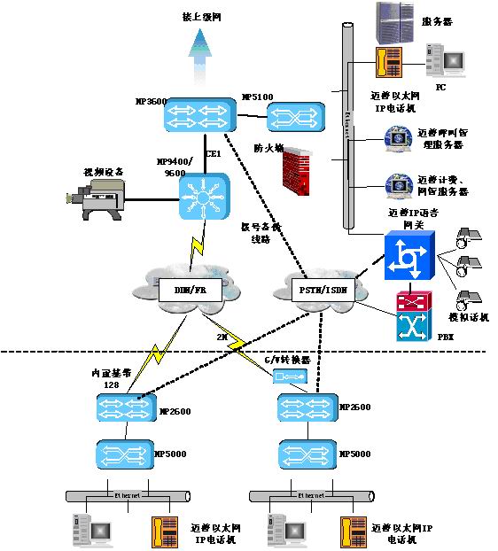 目前許多公安系統(tǒng)雖然采用具有IP語音功能的路由設備組建網(wǎng)絡,但在業(yè)務語音交流通常還通過PBX集團交換機走電信PSTN/ISDN電話網(wǎng),這樣無法節(jié)省電話費用,反而增加了辦公費用。邁普IP語音解決方案采用了邁普MyPower VG2000IP語音網(wǎng)關和邁普以太網(wǎng)IP電話進行改造。在整個網(wǎng)點語音終端全部設備選用經(jīng)濟型邁普以太網(wǎng)IP電話機,它采用雙以太口設計,使網(wǎng)絡無需重新布線,同時也可使用已有的路由器上IP語音模塊;邁普以太網(wǎng)IP電話機之間的話音通信通過邁普呼叫管理服務器集中控制。在主體IP網(wǎng)絡中,邁普IP語音網(wǎng)關放置于中心機房作為傳統(tǒng)PSTN的出口,可以通過VOS接口、E1接口(中國一號信令)、E&M接口等多種方式接入公安PBX,將PSTN線路傳來的時分話音或傳真信息進行分組和壓縮,轉換成IP數(shù)據(jù)包,通過路由設備路由到目的地;在沒有PBX的公安機房,邁普IP語音網(wǎng)關可以提供32路的模擬用戶接口,可以完全替代傳統(tǒng)PBX并接入PSTN,并提供額外功能,如圖中虛線所示;整個方案還可以針對公安用戶特殊需求"定做"特色功能,例如緊急告警等方便日常辦公。