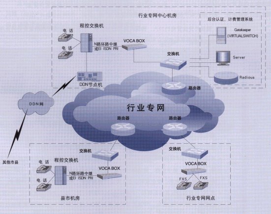 中心并設(shè)立一級計(jì)費(fèi)認(rèn)證及結(jié)算中心、網(wǎng)絡(luò)管理中心(VBMS),對網(wǎng)內(nèi)電話集中管理和計(jì)費(fèi)。通過在各地市機(jī)構(gòu)原有的內(nèi)部網(wǎng)絡(luò)基礎(chǔ)上增加數(shù)臺VOCABOX實(shí)現(xiàn)語音終端接入,并在地市機(jī)構(gòu)通過帶FXO接口的VOCABOX實(shí)現(xiàn)內(nèi)部IP電話與內(nèi)部電話網(wǎng)絡(luò)的呼叫轉(zhuǎn)接,網(wǎng)絡(luò)拓?fù)溥B接如下圖所示