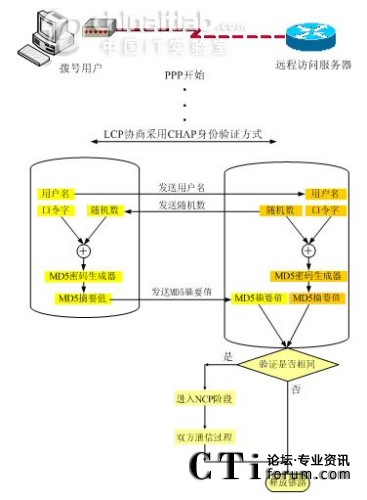 Protocol,PAP)和質(zhì)詢(xún)握手協(xié)議(Challenge Handshake Authentication Protocol,CHAP)。如果雙方協(xié)商達(dá)成一致,也可以不使用任何身份認(rèn)證方法。質(zhì)詢(xún)握手協(xié)議認(rèn)證(CHAP)相比口令驗(yàn)證協(xié)議認(rèn)證(PAP)安全性更高,因?yàn)镃HAP不在線(xiàn)路上發(fā)送明文密碼,而是發(fā)送經(jīng)過(guò)摘要算法加工過(guò)的隨機(jī)序列,也被稱(chēng)為"挑戰(zhàn)字符串".如下圖所示。