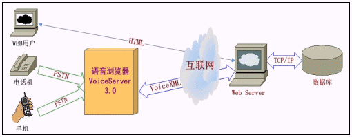 聲軟科技的語音網(wǎng)站系統(tǒng)《XVoice Portal 3.0》的核心系統(tǒng)是本公司的拳頭產(chǎn)品VoiceServer 3.0。VoiceServer 3.0和企業(yè)互聯(lián)網(wǎng)站上的Web服務(wù)器組成企業(yè)的語音門戶網(wǎng)站。只需在網(wǎng)站上存放相應(yīng)的VoiceXML頁面,客戶撥打連接VoiceServer的接入電話號(hào)碼,VoiceServer利用語音瀏覽的功能播放網(wǎng)站上的內(nèi)容,系統(tǒng)就能運(yùn)轉(zhuǎn)起來,為客戶提供語音服務(wù)。以下是系統(tǒng)結(jié)構(gòu)圖: