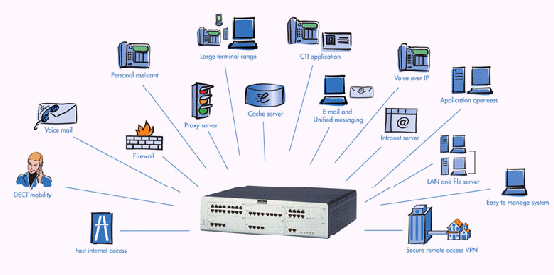 - 一體化:將多項(xiàng)功能集成到一個(gè)單一設(shè)備中,這些包括:因特網(wǎng)接入、E-mail服務(wù)器、局域網(wǎng)、計(jì)算機(jī)電話集成(CTI)、呼叫管理(嵌入式個(gè)人助理及語(yǔ)音信箱,內(nèi)部移動(dòng)通信等)。
