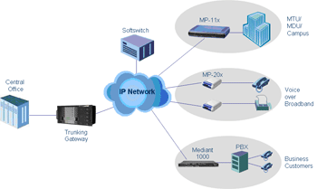 寬帶語音(VoBB)和 IP-Centrex 網(wǎng)絡(luò)正在使用 MP-202 電話適配器來連接住宅用戶和 SOHO 用戶。 MediaPackTM 網(wǎng)關(guān)和 MediantTM 1000 則用于將中小型企業(yè)客戶連接到 IP-Centrex 網(wǎng)絡(luò)。