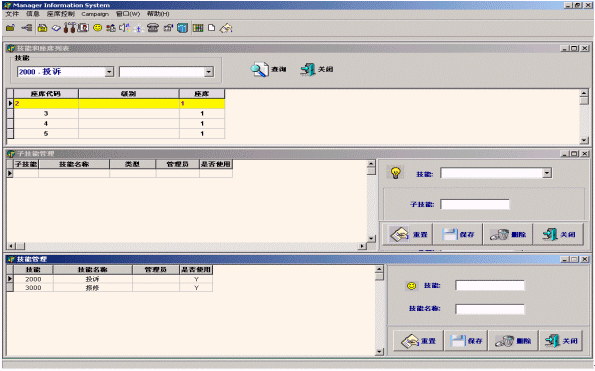 管理程序用于對一些基本參數(shù)的設(shè)置以及對座席、中繼線等資源進(jìn)行管理。按客戶等級座席熟練程度、業(yè)務(wù)分類進(jìn)行座席分組,按基于技能、狀態(tài)進(jìn)行呼叫分配。對技能組進(jìn)行設(shè)置。在管理程序中,對子技能、休息代碼等一些基本代碼的設(shè)置均通過相同的方式進(jìn)行