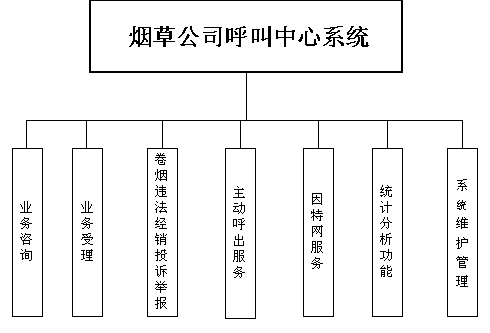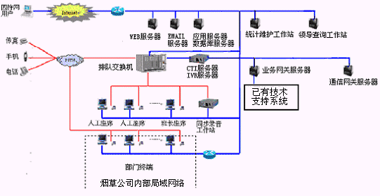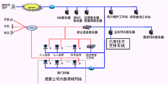 卷煙經(jīng)銷(xiāo)戶等客戶利用電話、傳真、電子郵件、因特網(wǎng)、手機(jī)、短消息等撥打統(tǒng)一的特服號(hào)碼(如800XXX或9XXXX)進(jìn)入煙草公司呼叫中心,本系統(tǒng)依托煙草公司各類(lèi)業(yè)務(wù)技術(shù)支持系統(tǒng)和網(wǎng)絡(luò)系統(tǒng),實(shí)現(xiàn)煙草專賣(mài)局原有管理系統(tǒng)/業(yè)務(wù)系統(tǒng)及數(shù)據(jù)庫(kù)的無(wú)縫連接,通過(guò)人工受理或自動(dòng)語(yǔ)音服務(wù)等方式全天24小時(shí)不間斷地為客戶提供各種服務(wù)。