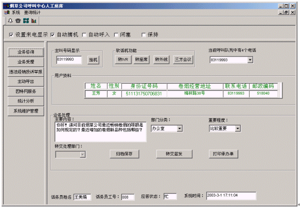 煙草公司呼叫中心將接入功能、導(dǎo)航功能、自動(dòng)語(yǔ)音查詢功能、人工座席服務(wù)功能、話路轉(zhuǎn)接功能、信息資料處理緊密聯(lián)系起來(lái)。用戶撥打特服電話號(hào)碼后,可以根據(jù)需要選擇人工服務(wù)、自動(dòng)語(yǔ)音查詢、自動(dòng)留言,并能夠在幾種服務(wù)中來(lái)回切換或轉(zhuǎn)接其它電話;所記錄的資料可以分門(mén)別類(lèi)的進(jìn)行統(tǒng)計(jì)并形成報(bào)表,供相關(guān)部門(mén)進(jìn)行檢索查閱;意見(jiàn)處理完畢,可由座席主動(dòng)呼叫用戶,告知處理意見(jiàn),形成閉環(huán)處理流程。