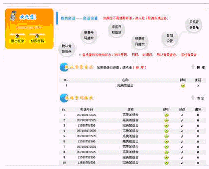 彩話業(yè)務(wù)系統(tǒng)BYBGM2.0功能強(qiáng)大,它允許將被叫分為不同的組或者將其設(shè)置為特殊號(hào)碼,這樣將可以設(shè)置他們的默認(rèn)背景音樂,還可以針對(duì)他們?cè)O(shè)置紀(jì)念日或者按照不同的時(shí)段設(shè)置不同的背景音樂。當(dāng)用戶喜歡幾首音樂但又不希望每次都聽相同的音樂時(shí),可以將一定數(shù)目的音樂設(shè)置為一個(gè)音樂盒(Music-Box),這樣系統(tǒng)會(huì)每次到音樂盒中隨機(jī)選取一首音樂作為彩話背景音樂。系統(tǒng)中提供的音樂素材不能滿足用戶的需求時(shí),用戶可以通過"彩話DIY"服務(wù)自己錄制音樂素材到系統(tǒng)中或?qū)⒅付ǜ袷降囊魳匪夭纳蟼鞯较到y(tǒng)中,充分展現(xiàn)自己的個(gè)性和創(chuàng)作才華。在通話過程中,用戶也可以隨心所欲控制彩話,這就是"隨心變奏"服務(wù),通過它用戶可以在通話過程中變換彩話背景音樂或音量的大小,這就使得用戶甚至可以編制一個(gè)通話場景(不同的背景音樂、不同的音效),并可以根據(jù)被叫的反應(yīng)及時(shí)加以控制,從而得以充分展現(xiàn)自己的通話魅力。