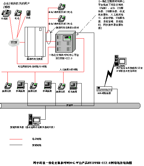 深圳博宇科技一體化交換機(jī)呼叫中心平臺(tái)產(chǎn)品BYIPPBX-CC2.0的呼叫中心系統(tǒng)網(wǎng)絡(luò)拓?fù)浣Y(jié)構(gòu)如下: