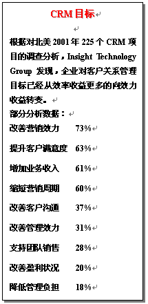 3.對于客戶關系管理工作的總體目標有明確的設定,并可據(jù)此逐步分解到效益收益、客戶管理、業(yè)務運營、組織人員和信息技術等具體客戶關系管理目標;