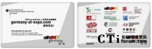 CTI論壇(ctiforum)5月17日消息(記者 潘婷婷):2010年5月,世人矚目的上海世博會已經(jīng)隆重開幕,德國館是其中的大熱門之一。想一睹德國館的風采,一般都需要排2~3個小時的長隊。而觀眾可能不知道除了德國國家館外,德國還有多個城市在浦西的城市最佳實踐區(qū)展出。為了讓觀眾更好、更全面地體驗德國參展的所有活動,德國駐上?傤I事館聯(lián)手智能卡領域的專家捷德公司共同推出了德國館智能參觀卡,觀眾只需持卡參觀德國的其他相關展區(qū)后,就可以不用排隊進入德國國家館了。