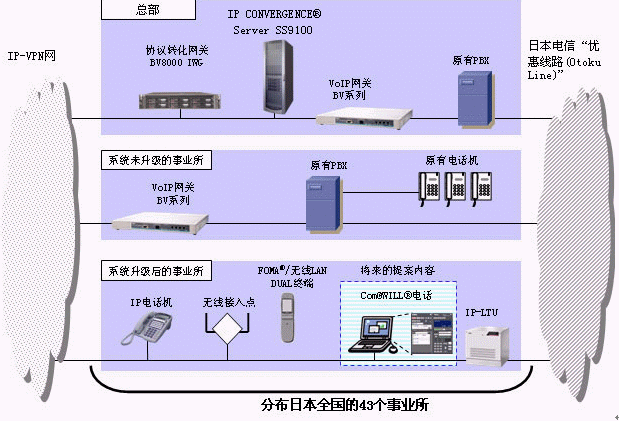 在IP網(wǎng)上實現(xiàn)語音通信的同時,將設(shè)置在各個事業(yè)所的PBX用集中在1個地點統(tǒng)一管理和運營的IP電話導(dǎo)入系統(tǒng)。不僅能夠大幅度降低運營成本,而且可以繼續(xù)使用原有PBX具備的多功能,具有能有效使用原有設(shè)備、可以與企業(yè)內(nèi)部業(yè)務(wù)應(yīng)用系統(tǒng)結(jié)合使用的特長。