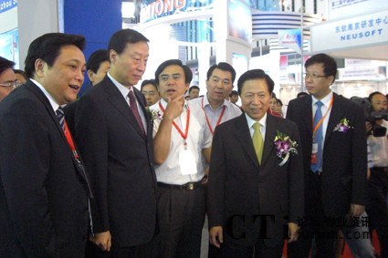 圖為省委書記梁保華(右二)、省長羅志軍(左二)、省外經(jīng)貿(mào)廳副廳長趙進(右一)在常州副市長韓九云(左一)等的陪同下視察沖電氣軟件技術(shù)(江蘇)有限公司展臺