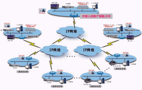 中國(guó)人民財(cái)產(chǎn)保險(xiǎn)股份有限公司,是中國(guó)內(nèi)地最大的非壽險(xiǎn)公司,香港證交所上市公司。經(jīng)過(guò)50多年的發(fā)展,中國(guó)人保財(cái)險(xiǎn)公司已經(jīng)發(fā)展成為網(wǎng)點(diǎn)遍布全國(guó)31個(gè)省市區(qū),共有營(yíng)業(yè)機(jī)構(gòu)4000余個(gè)的大型商業(yè)公司。為提高辦公效率,降低差旅成本,中國(guó)人保財(cái)險(xiǎn)公司決定建設(shè)覆蓋從總公司、省分公司到地市分公司的視頻會(huì)議系統(tǒng),項(xiàng)目總?cè)萘窟_(dá)600多個(gè)節(jié)點(diǎn),采用兩級(jí)級(jí)連方式組網(wǎng),要求系統(tǒng)具備視頻、音頻、數(shù)據(jù)交互功能,。