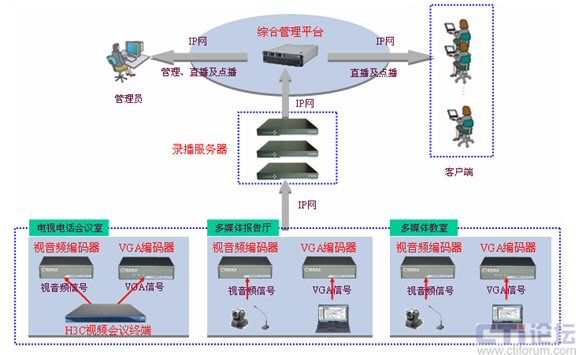 對于電視電話會議的錄播,可以將視頻會議終端的視音頻信號和VGA信號(視頻會議中的“雙流”)輸入到視音頻編碼器和VGA編碼器上,由視音頻編碼器和VGA編碼器將音視頻信號和VGA信號進(jìn)行編碼,編碼后通過網(wǎng)絡(luò)傳給錄播服務(wù)器進(jìn)行信號處理、整合,最終傳輸?shù)骄C合管理平臺上。