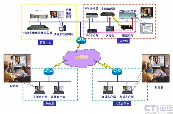 如圖所示:多媒體錄播服務器放置在管理中心,高清編碼器(采集高清視頻及聲音)及VGA編碼器(采集雙流信號)放置在會議室,客戶端可以是網(wǎng)絡內(nèi)的任意一臺計算機。整個系統(tǒng)簡單明了,分布靈活,部署簡單,系統(tǒng)只要連接了信號線,配置了IP地址即可投入使用,無須專業(yè)布線。各部分配置如下:
