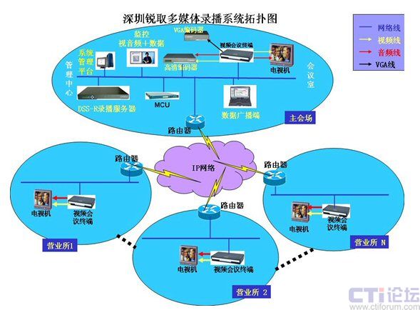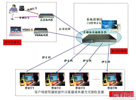 如上圖所示,在多媒體股評直播室中,股評師的講解圖像和聲音以及電腦中分析數(shù)據(jù)同步傳輸采集到控制機(jī)房中,通過多媒體錄播服務(wù)器直播模塊的組播方式將信息傳達(dá)給全國遍布的營業(yè)網(wǎng)點(diǎn),實現(xiàn)股評直播的需求。(權(quán)威股評師將在每天下午股市休市后對一天當(dāng)中股票大盤做一次全面的分析,并對本周或某行業(yè)的形式做一個全面的總結(jié),并對未來形勢做出判斷。)