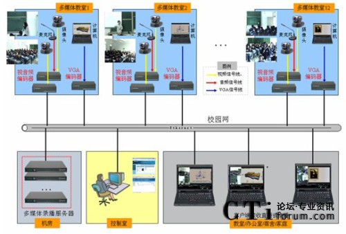 華東師大多媒體錄播項目系統(tǒng)組網(wǎng)如上圖所示。在本項目中12間多媒體教室內(nèi)均實現(xiàn)錄播功能,編碼器和多媒體錄播服務(wù)器分別部署在教室和機房內(nèi),管理員在控制室通過網(wǎng)絡(luò)進(jìn)行遠(yuǎn)程管理、控制,老師、學(xué)生可在教室、辦公室、宿舍等任何可以連接校園網(wǎng)的地方實時觀看各間教室內(nèi)進(jìn)行的課程,可滿足日常多媒體教學(xué)、課件錄制、微格教學(xué)等應(yīng)用的需要。其中涉及銳取設(shè)備清單及說明如下: