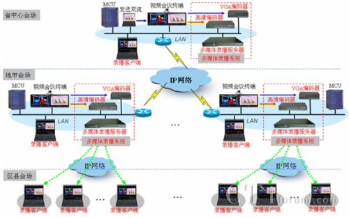 項目中采用了17套銳取高清錄播系統(tǒng),分別部署省國稅及下轄16個州、市國稅。銳取高清錄播系統(tǒng)采用分布式產(chǎn)品架構(gòu),由多媒體錄播服務(wù)器和前端的編碼器組成。多媒體錄播服務(wù)器部署在網(wǎng)絡(luò)機房;高清編碼器和VGA編碼器分別部署在高清視頻會議室,編碼器從華為高清視頻會議終端獲取視音頻及雙流信號,并通過IP網(wǎng)絡(luò)發(fā)送給機房內(nèi)多媒體錄播服務(wù)器,由多媒體錄播服務(wù)器實現(xiàn)視頻會議的錄制、直播和點播。分會場及不具備視頻會議終端的地方,可使用電腦登陸多媒體錄播服務(wù)器來接收會議的實時直播或在會后進行點播。