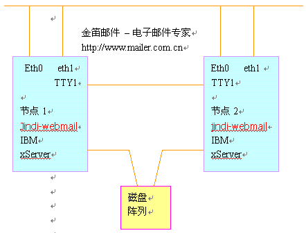 本項目采用金笛集群郵件系統(tǒng),通過兩臺IBM PC服務器實現(xiàn)高可用性。支持SMTP, POP3,IMAP等主流協(xié)議,支持WebMail,支持郵件列表等功能,同時要求兼容性好,與網站其他業(yè)務系統(tǒng)沒有沖突。