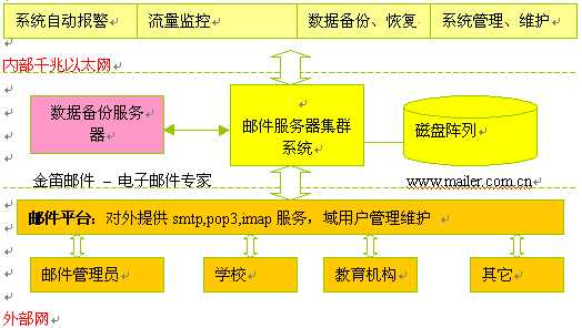 本方案是根據(jù)沈陽教育信息中心對電子郵件系統(tǒng)大容量、高擴展性、分級管理的實際要求,結合金笛郵件集群系統(tǒng)的技術特點,本著高速穩(wěn)定、易于管理、易于維護、適度超前的原則,可以作為實施方案的參考。