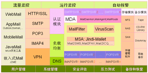 1. 郵件集群系統(tǒng)由二個smtp server、一個pop3/imap server、一個認證服務器ldap、和磁盤陣列組成。監(jiān)控中心由流量監(jiān)控、運行監(jiān)控、SMS報警、系統(tǒng)管理、查詢運維終端組成。