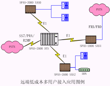 tyutSPAS-2000可編程交換機(jī)通過E1可以支持多個遠(yuǎn)端模塊。遠(yuǎn)端模塊采用SPAS-2000 SAS框,可以帶多種用戶接口:普通模擬用戶、DDN、環(huán)路中繼用戶;通過SPAS-2000 DTS對外提供各種信令接入。適合多點(diǎn)接入組網(wǎng),組網(wǎng)成本低廉。 在示意圖中,SAS表示遠(yuǎn)端用戶接入框,它可以通過需要選擇接入模擬用戶:FXO/FXS、E/M、普通模擬用戶和DDN。中心為SPAS可編程交換機(jī),可以通過 SS7/PRA/R2MF進(jìn)行匯接轉(zhuǎn)換。