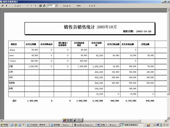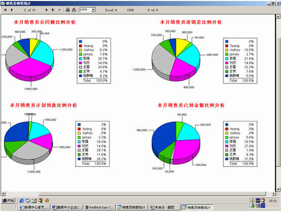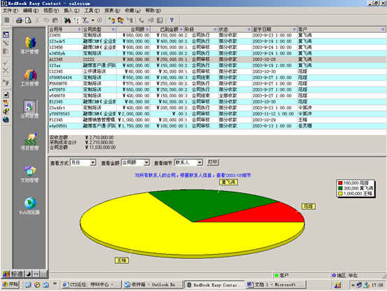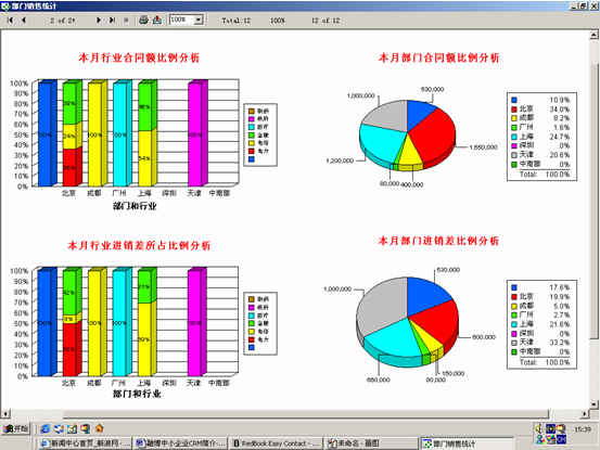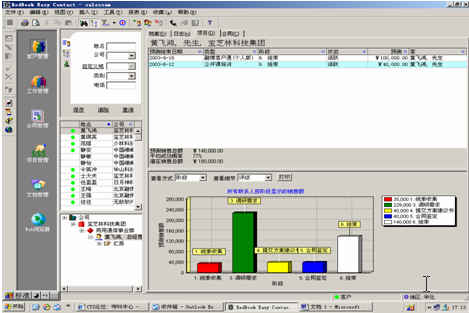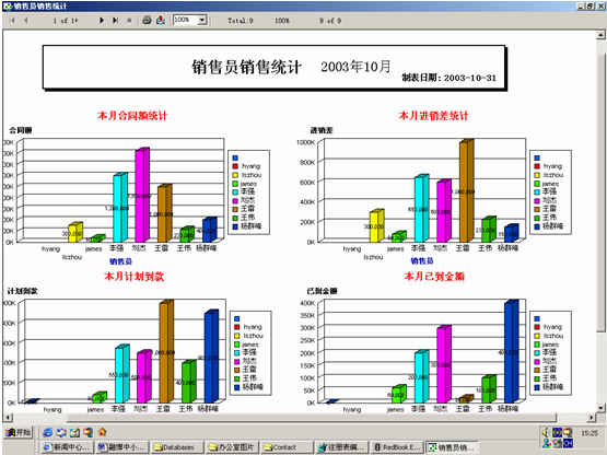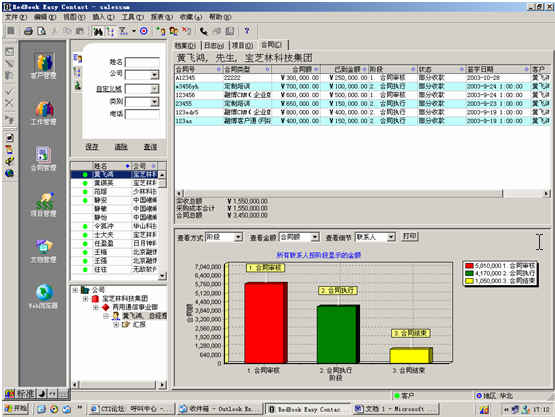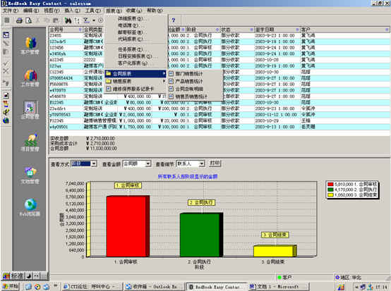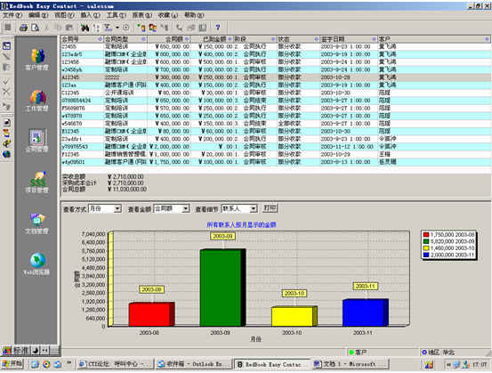 可對(duì)客戶(雇員)合同,根據(jù)合同階段、月份、合同金額、合同應(yīng)收應(yīng)付款、采購(gòu)成本、客戶、銷售人員等條件進(jìn)行查詢和統(tǒng)計(jì), 查詢統(tǒng)計(jì)結(jié)果以詳細(xì)列表及圖示進(jìn)行顯示。