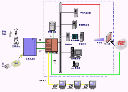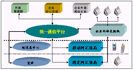統(tǒng)一通信平臺提供了與企業(yè)內(nèi)部交換機(PBX)或PSTN,寬帶或INTERNET和GSM或GPRS網(wǎng)絡(luò)的接口,融合了多種網(wǎng)絡(luò)資源和企業(yè)內(nèi)部數(shù)據(jù)源。為用戶提供了多種服務(wù)界面:WEB界面、人工服務(wù)界面,IVR界面。同時為用戶提供短信息等數(shù)據(jù)業(yè)務(wù)。