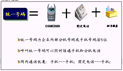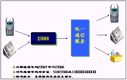 鐵路內(nèi)部員工可以統(tǒng)一所有的通信工具,只使用一個號碼,一次呼叫便可以完成通信,使通信更加簡單、可靠?梢詫崿F(xiàn)換機換網(wǎng)不換號,用戶獲得一個終身的聯(lián)系號碼,用戶無論更換任何通信工具,聯(lián)系號碼和方式不會改變。例如:在路局領(lǐng)導(dǎo)找下屬的時候,只需要撥打他的統(tǒng)一號碼,便可以直接找到他。不必考慮他是否在外出還是在辦公室,是否更換了手機號碼。統(tǒng)一號碼就像他員工號碼,始終不變,即撥即通!
