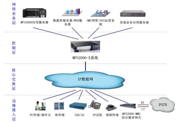 控制層:由MPS2000-X作為軟交換應(yīng)用,完成呼叫控制、媒體網(wǎng)關(guān)接入控制、資源分配、協(xié)議處理、路由、用戶認(rèn)證、計(jì)費(fèi)等功能,并可向用戶提供基本語音業(yè)務(wù)、增值語音業(yè)務(wù)、話務(wù)臺(tái)業(yè)務(wù)等。