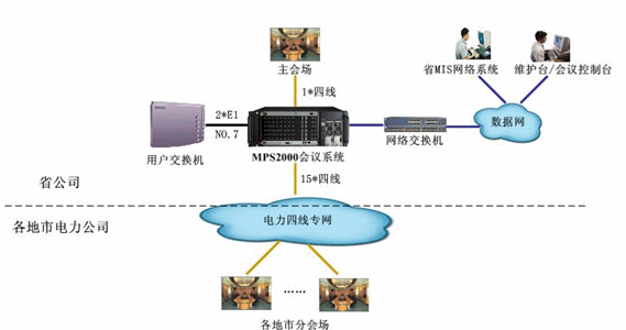 該會議系統(tǒng)是安徽省公司與地市電力公司“一主兩備”系統(tǒng)的電話會議系統(tǒng)備份系統(tǒng),通過2個數(shù)字中繼與省通信公司用戶交換機互連,采用NO.7信令。16路4線中1路接主會場調音臺,實現(xiàn)會議室擴音設備的接入,其余15路接各地市電力公司原四線專網(wǎng)資源連接,通過以太網(wǎng)口與D-LINK網(wǎng)絡交換機互連,接入安徽省電力的數(shù)據(jù)網(wǎng),實現(xiàn)實時維護管理及會議控制等功能。